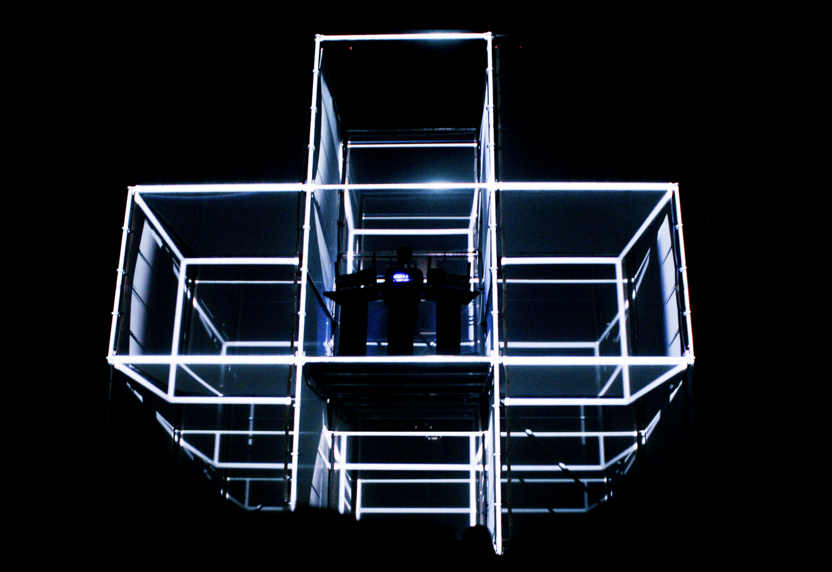 In Étienne de Crécy’s “Beats and Cubes” live shows (2007), they constructed a luminous cubic structure whose geometry was mapped with video and synchronized with electronic sound. The cube pulsed, folded, and unfolded in sync with the beat — architecture became instrument, façade became choreography.