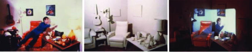 In his project Displacements (1980–84), he filmed a domestic scene using a rotating camera, then projected the same footage back into the same space using a rotating projector. The result was uncanny — a ghost of the recorded world haunting its original location.